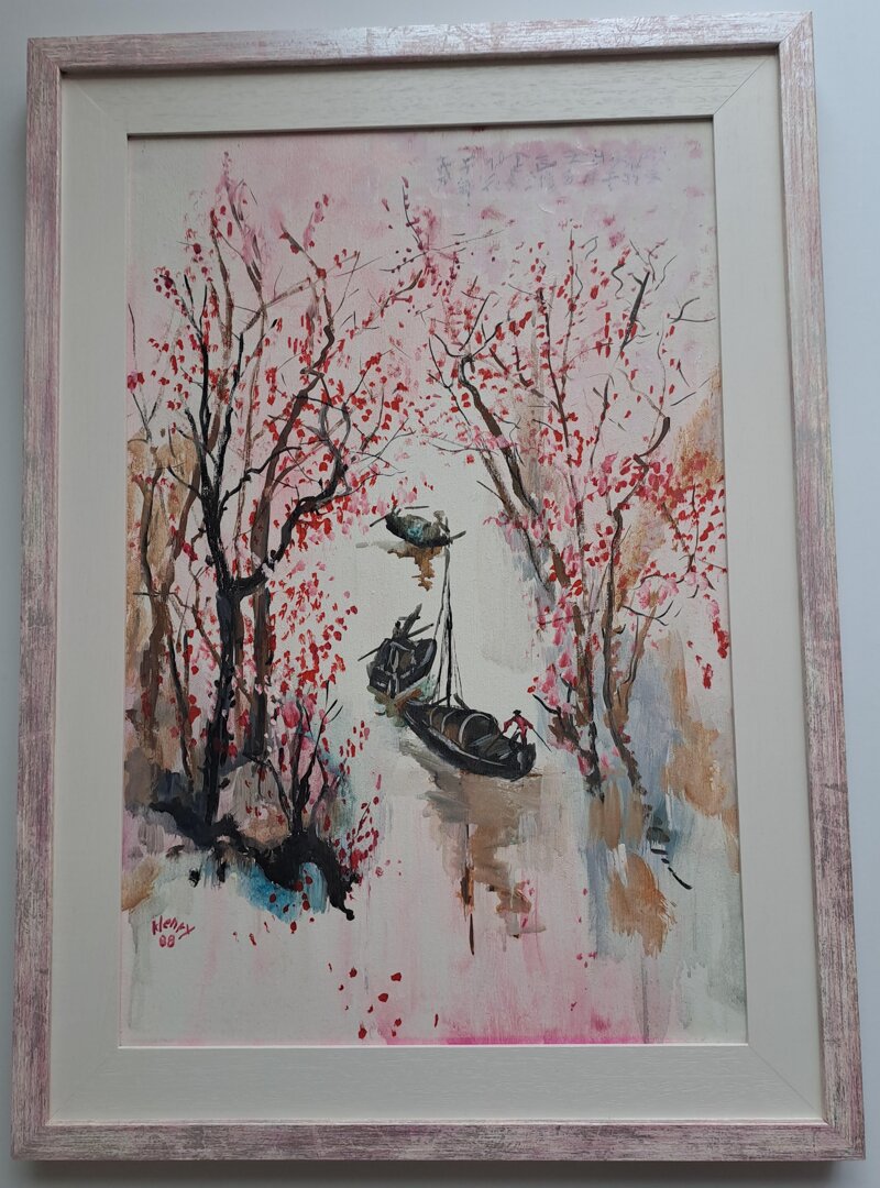Paesaggio con alberi in fiore, dipinto su tela, 50x70cm con cornice